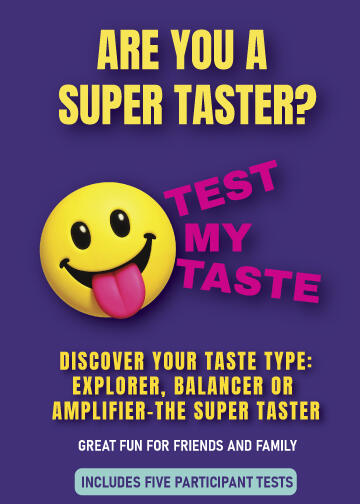 Discover how strong your taste buds really are—and whether you’re an Explorer, Balancer, or Amplifier (Super Taster). Find out with this fun taste test kit, available for one, five, or ten participants